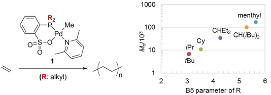 後周期遷移金属触媒を用いたエチレンと極性モノマーの共重合反応は、分岐鎖が少なく構造が制御された官能基化ポリエチレンを得る合成法として近年注目を集めています。なかでも、ホスフィン-スルホナート配位子を有するパラジウム錯体は、様々な極性ビニルモノマーとの共重合に適用可能です。しかし、この触媒で得られる共重合体は分子量が低いという問題がありました。本研究では、ホスフィン-スルホナート配位子のリン上の置換基として種々のアルキル基を有する配位子の合成および重合触媒活性の検討を行いました。その結果、リン上の置換基の立体的な大きさと分子量との間に強い相関があることを見出しました。共重合についても同様の相関がみられ、嵩高い配位子を用いることで既存の触媒に比べて高い分子量の共重合体が得ることができました。