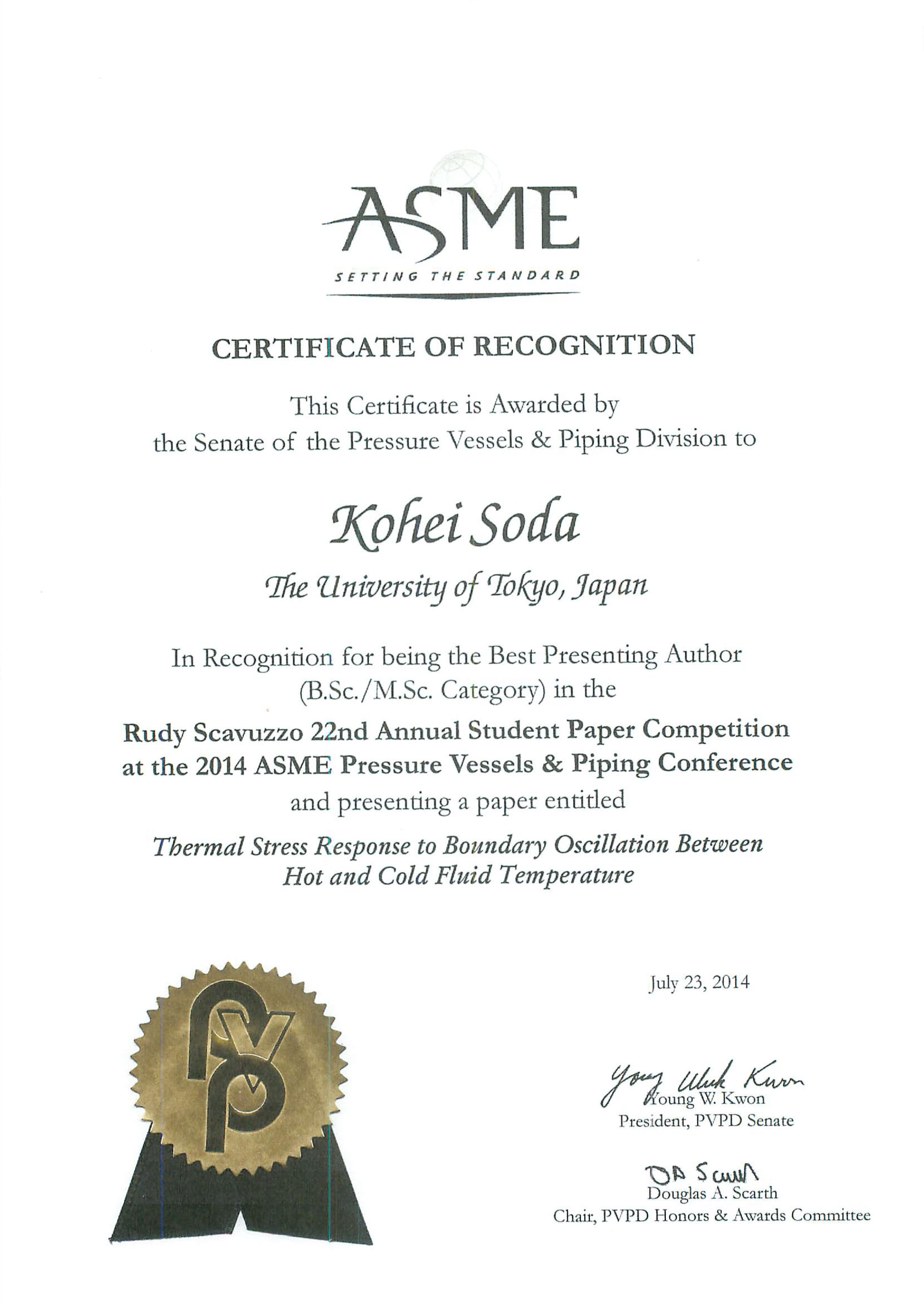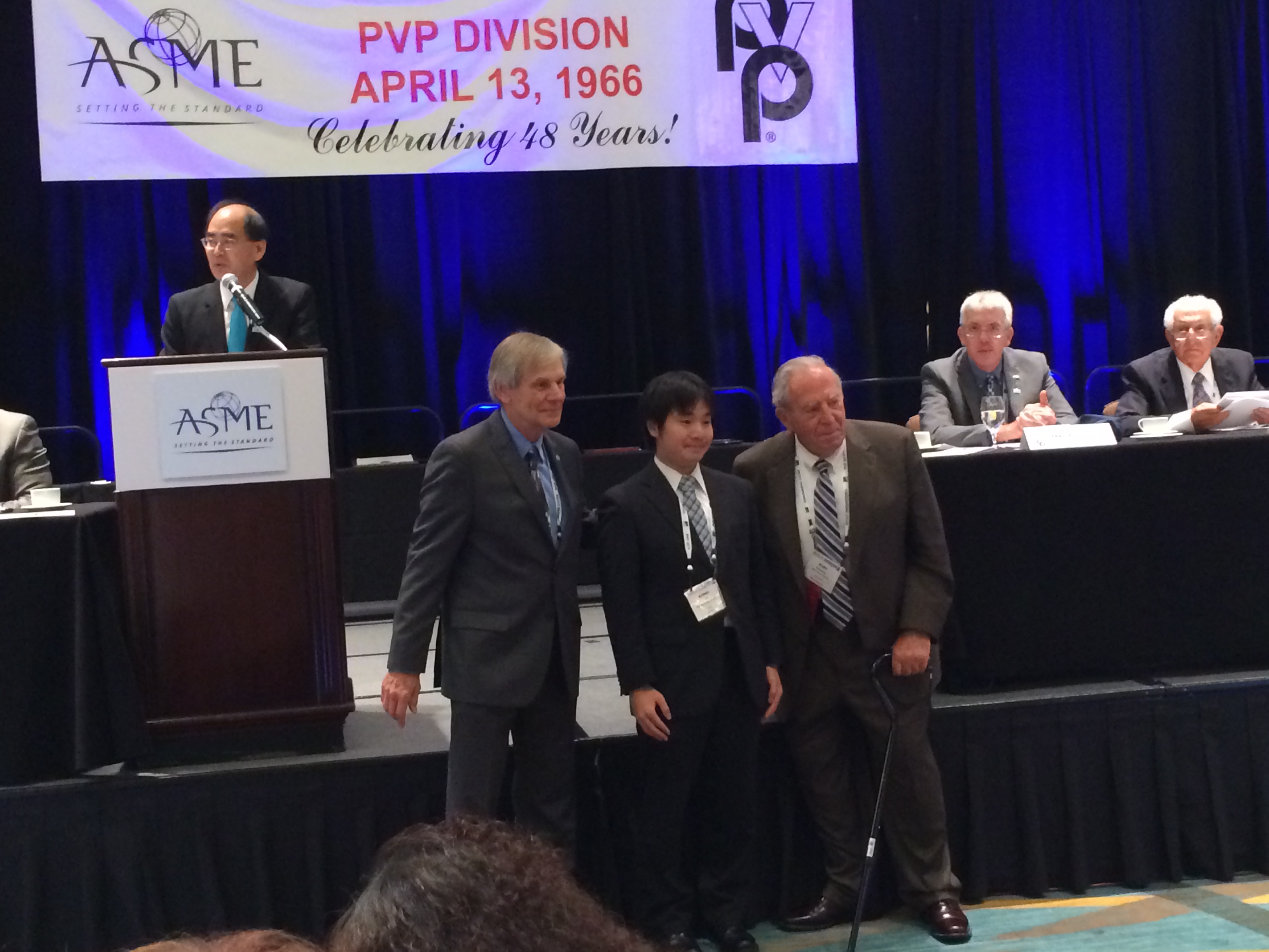 原子力国際専攻 早田浩平さんが、米国機械学会圧力容器・配管会議 (ASME PVP2014) 学生論文シンポジウム部門にてベストプレゼンテーション賞を受賞しました。ASME PVP2014は米国機械学会が主催し、日本、韓国、中国の機械学会等が協賛する、構造工学の分野では世界最大級の国際会議の一つです。学生部門としてはコンペティション部門とシンポジウム部門がありますが、ベストプレゼンテーション賞は学生論文シンポジウム部門において最も優秀な発表を行った学生が表彰されます。