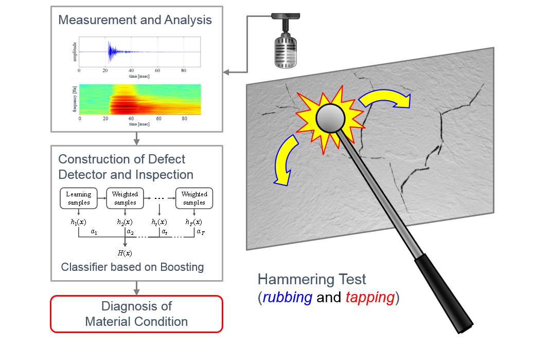 本研究は、社会インフラの保守・点検作業の自動化に関するものです。近年、深刻化が進む社会インフラの老朽化に対して、検査対象物を打診した際の音の違いから異常を検出する打音検査が注目を集めています。受賞した論文では、ハンマ音の違いからオンラインで異常箇所を検出するための基礎的なアルゴリズムを提案しています。提案した手法を用いて実際のオフィス建築物の壁を打診することで、石膏ボードの壁に生じたひび割れだけではなく壁の背後にある空間や金属体などの構造の検出も実現しました。